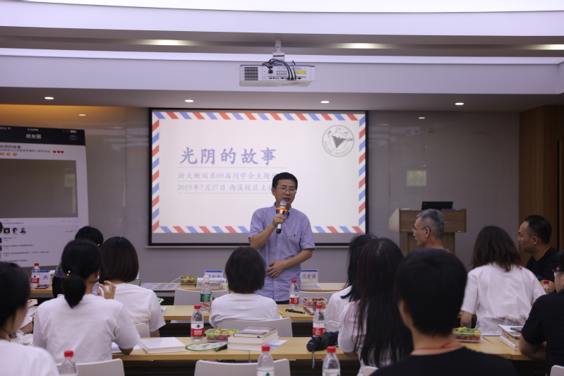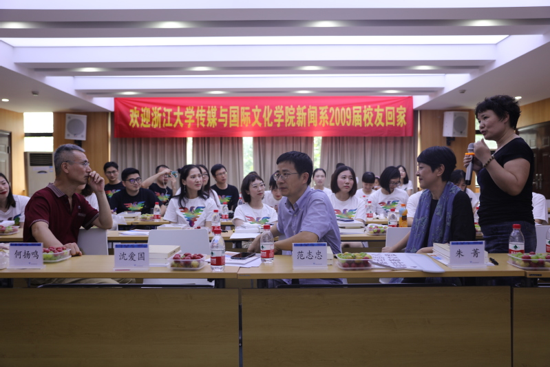 班会一开始,在同学们的热情邀请下,学院副院长范志忠老师、新闻与传播学系主任沈爱国老师、副主任朱菁老师、何扬鸣老师、策略传播系副主任章燕老师依次发言,老师们向同学们介绍了现在学院的情况,回忆了当年上课的趣事,希望同学们多回来看看母校,同时也表达了对同学们未来美好生活的祝福。