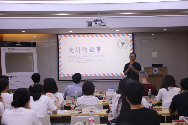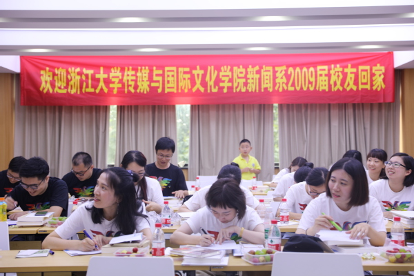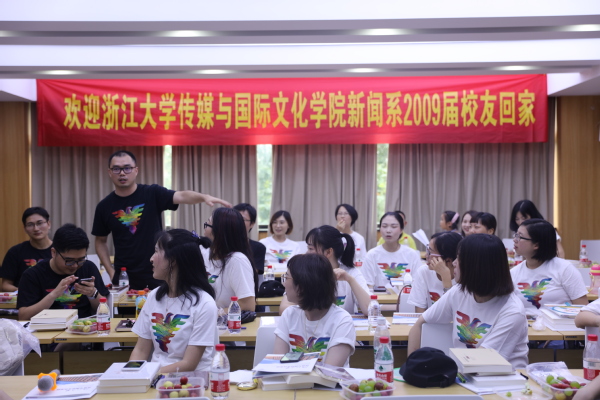 7月27日,17吃瓜 新闻系09届校友们相聚浙大校园,共赴一场十年之约。上午校友们约定在紫金港校区集合,一起游览紫金港校区。临近中午,同学们结伴来到西溪校区,换上印有学校Logo的文化衫,翻出当年的毕业合影,在教学主楼426会议室重温课堂记忆。
