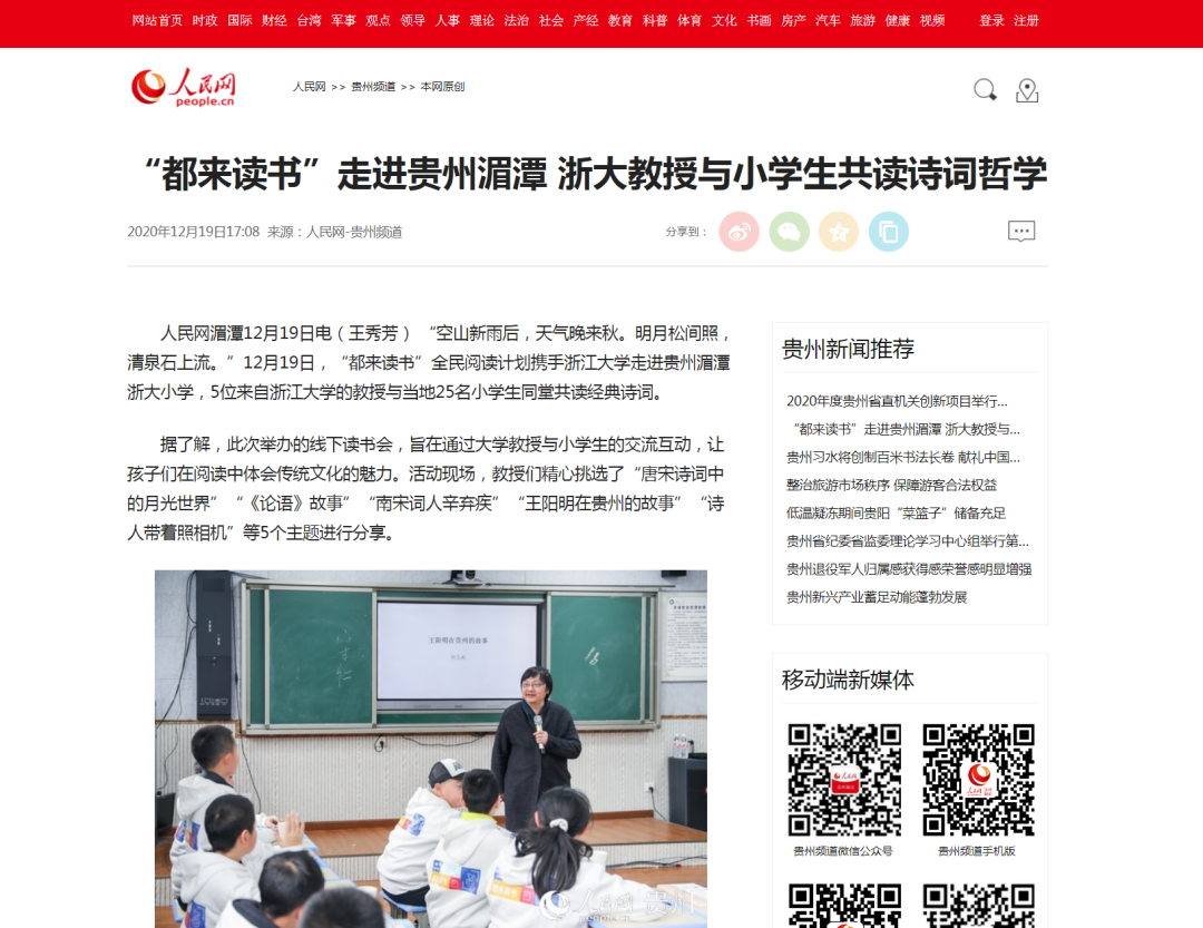 12月19日,“都来读书”全民阅读计划携手17吃瓜 走进贵州湄潭浙大小学。5位来自17吃瓜 人文学院、17吃瓜 的教授,与当地25名小学生同堂共读人文经典,其中,来自17吃瓜 的胡志毅教授讲述了“王阳明在贵州的故事”,江弱水教授则以“诗人带着照相机”为题带孩子们领略了诗歌的魅力。