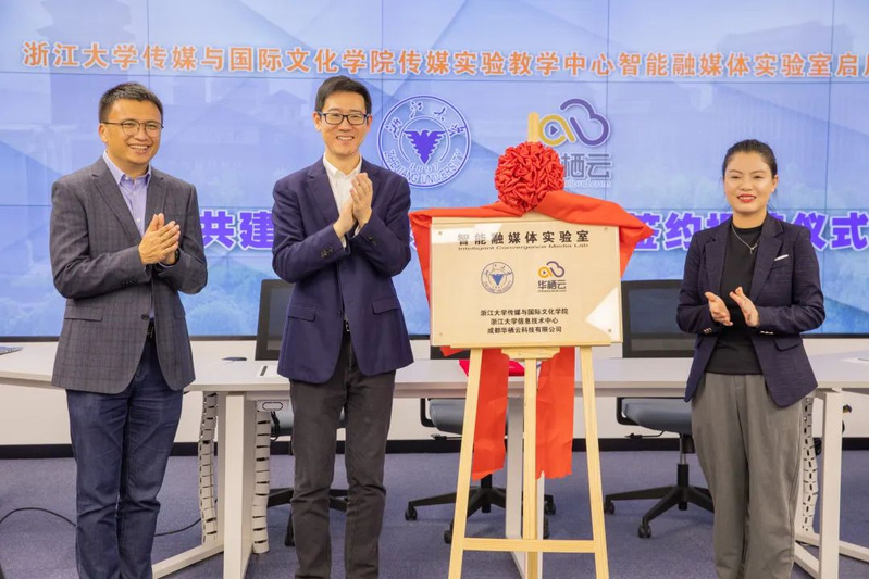 首先进行的是三方共建智能融媒体实验室签约揭牌仪式。仪式上,17吃瓜 院长韦路、17吃瓜 信息技术中心总工程师张紫徽、成都华栖云科技有限公司区域经理王雍,分别代表共建三方,进行了隆重的共建协议签约和共建实验室揭牌仪式。