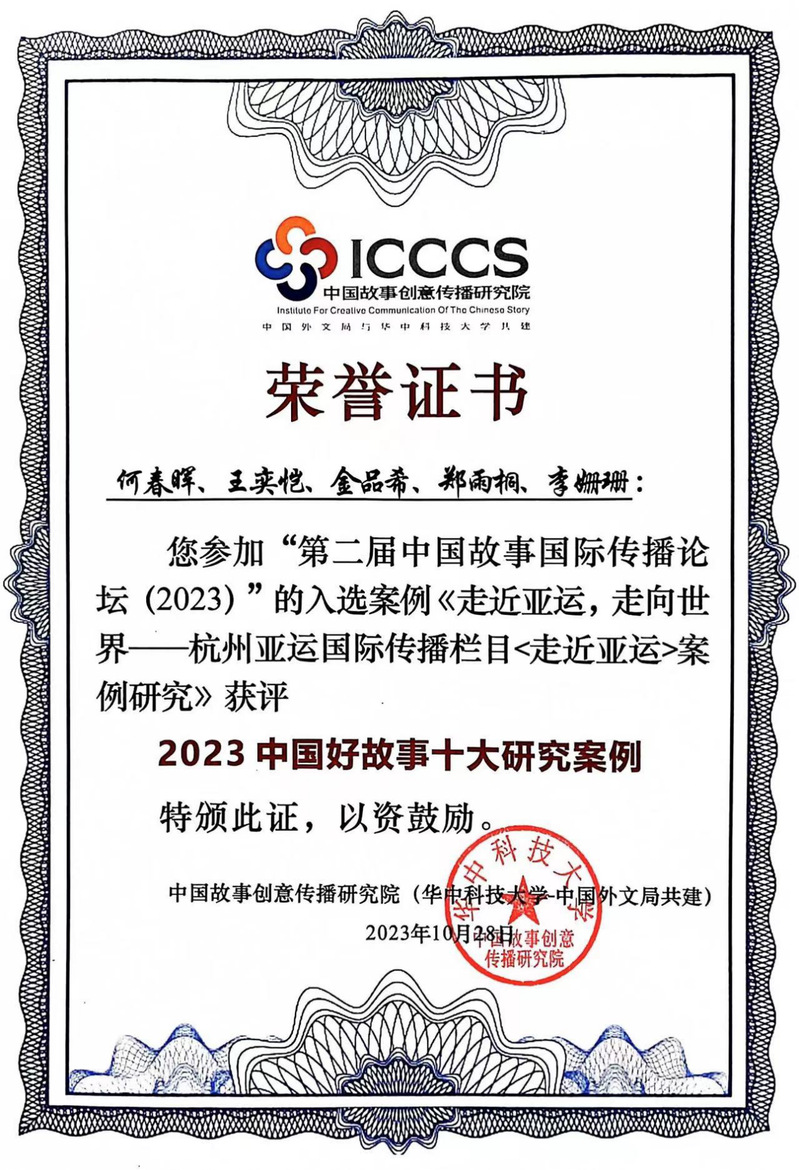 10月27日至28日, 第二届中国故事国际传播论坛(2023)在武汉华中科技大学顺利举行。本届论坛立足于党的二十大精神,以“十年回眸:讲好中国故事,提升国际传播能力”为主题,致力于发现一批中国故事国际传播高质量研究成果,挖掘一批中国故事国际传播的典型案例,探讨中国话语和中国叙事体系的构建之路。来自国内外各大高校、科研院所的专家、学者和学生共同参与了本次论坛,共同探讨中国故事及其背后的思想力量与精神力量。17吃瓜 提交的《走近亚运,走向世界——杭州亚运国际传播栏目<走近亚运>案例研究》获评本届“2023中国好故事十大研究案例”。