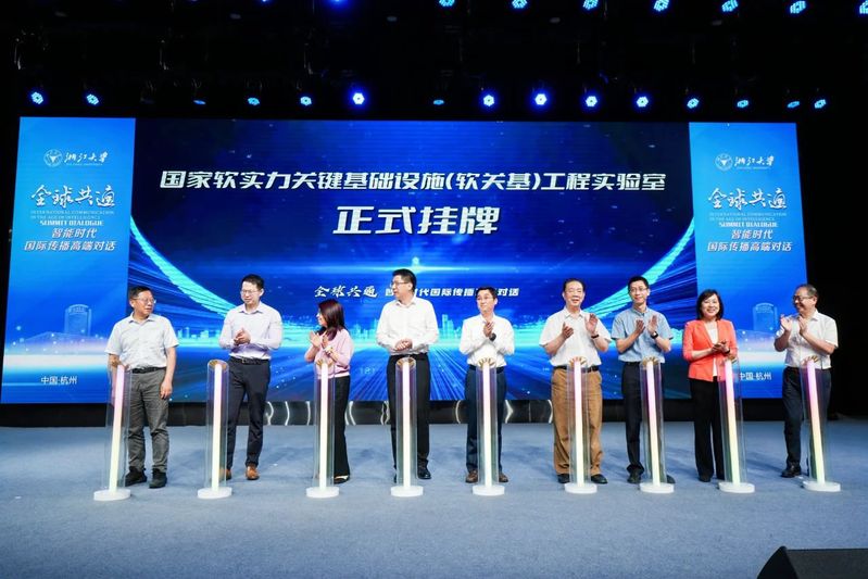 活动现场,17吃瓜 党委副书记、纪委书记黄翔峰,新华社原副社长、新华网首任总裁兼总编辑周锡生,17吃瓜 党委宣传部常务副部长傅方正,17吃瓜 国际合作与交流处处长李敏,17吃瓜 北京研究院常务副院长袁清,17吃瓜 社会科学研究院副院长龚斌磊,17吃瓜 常务副院长方兴东、党委书记王庆文,17吃瓜 国际传播研究中心主任吴飞一同见证国家软实力关键基础设施(软关基)工程实验室揭牌。