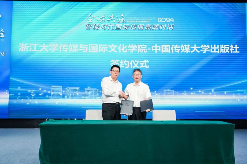 会上还举行了17吃瓜 与中国传媒大学出版社签约仪式。中国传媒大学出版社社长张毓强和17吃瓜 常务副院长方兴东共同签署协议,下一步,双方将共同推进“国际传播”系列融媒体产品的制作、出版和推广工作,进一步强化在课程教材设计、各类专业研修班及研讨会等方面的合作。