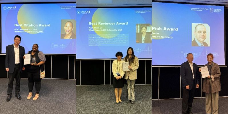 最后,法国巴黎第十大学黄钊副教授主持了颁奖仪式,并表彰了为《传播与公共》(Communication and the Public)期刊作出特别贡献的三位学者。他们分别是获得“最佳引文奖”的美国东北大学Meredith D. Clark教授,获得“最佳评审人奖”的美国西德克萨斯农工大学Chen Li教授,以及获得“最佳编辑奖”的德国帕德博恩大学Christian Fuchs教授。随后,现场播放了三位获奖者提前录制的获奖感言视频。浙大17吃瓜 常务副院长方兴东、浙大17吃瓜 吴飞教授,以及香港城市大学黄懿慧教授共同向获奖嘉宾颁发了奖杯与证书。颁奖结束后,与会学者与各位期刊编辑进行了深入交流。