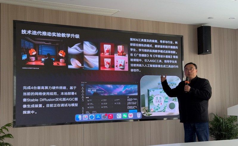 在上午的教学经验分享环节,教研室负责人卢小雁首先作《Al及相关数字技术在高校传媒实验及实践教学领域的应用》主题报告,向与会嘉宾介绍了17吃瓜 传媒实验教学中心目前对于AI技术及相关数字技术的引入与未来规划。