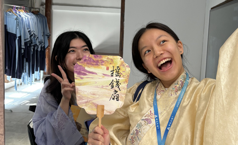 “巧夺天工凭妙手,美轮美奂见江南”,西塘古镇拥有为数众多的非物质文化遗产。游览之余,国际学生们自发前往了纽扣博物馆、瓦当文化体验馆等场所,专心聆听西塘非物质文化遗产的历史渊源、文化内涵与传承价值,深刻感受中华传统文化的源远流长、博大精深。并且,在老师的指导下,国际学生们还自己动手、以漆作画,亲身参与了“漆扇”的制作过程,零距离体验了中国非遗工艺的文化魅力,增强了对中国传统文化的认知与兴趣。